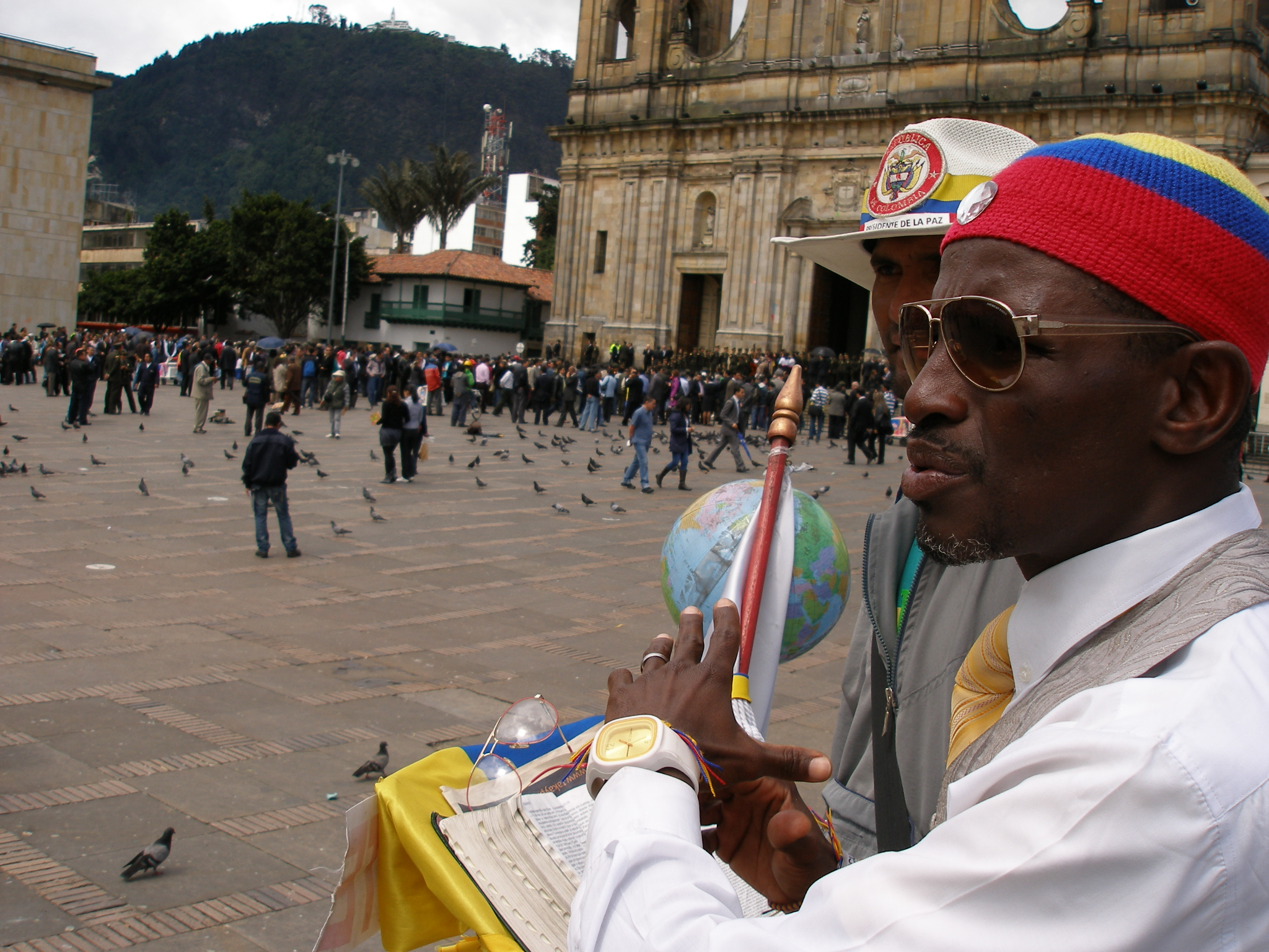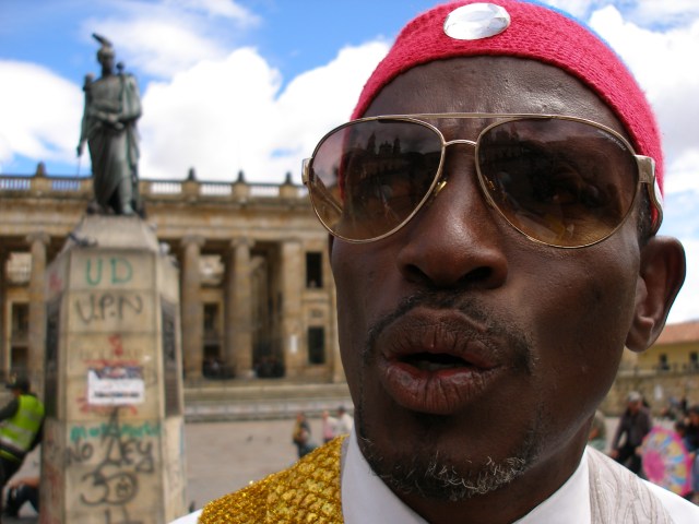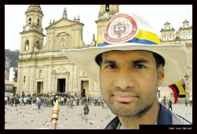 La plaza principal de la capital del país está enmarcada por colosos de rocas opacas. Al fondo el Capitolio Nacional, al frente el Palacio de Justicia, a lado y lado la Catedral Primada y el Palacio Liévano. En medio de ese paisaje ocre y gris, al pie de la estatua de Simón Bolívar y sus palomas inquilinas, hay un resplandor multicolor. Es un candidato presidencial en campaña eterna, que dice ser la reencarnación de Gandhi, la continuación de Martin Luther King, al tiempo que una especie de Papa colombiano; aunque su atuendo recuerde más a Gadafi, el excéntrico líder libio.