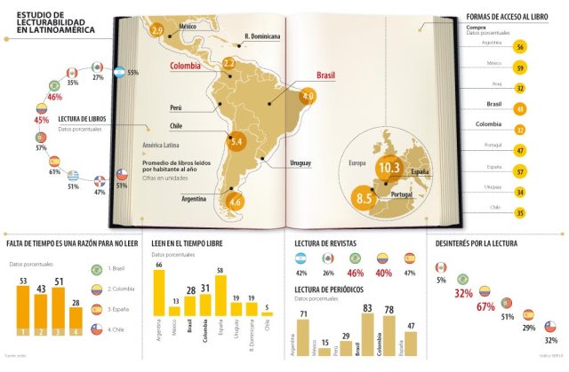 Las estadísticas están atadas a una lamentable consecuencia, aunque lógica: el promedio de libros leídos por año es también el más bajo de la Región. Los colombianos leen 2,2 libros al año, mientras que los brasileros leen 4, los argentinos 4,6 y los chilenos 5,4.