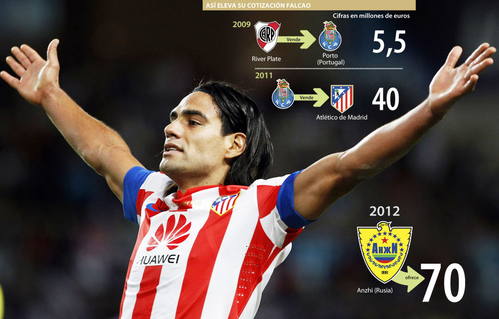 “Hoy perfectamente un equipo podría pagar por él entre 70 y 80 millones de euros”, calcula Nicolás Samper, periodista deportivo de La F.M. Radio. Explica, además, que el jugador se constituye en una especie de mina de oro para el Atlético. El equipo español atraviesa problemas financieros, que, por ejemplo, lo obligaron a venir a Colombia a jugar contra Millonarios, América, Nacional y Huila. “Es muy difícil que puedan retener a Falcao en siguientes temporadas ante las ofertas que llegarán de otros equipos”.
