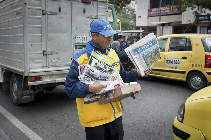 Luis está seguro de que la venta ambulante es todavía un buen negocio. “Sí da, siempre que sea juicioso. Si se va a jartar, a jugar billar, no”. Hasta hace unos años vendía 100 periódicos al día, ahora es afortunado si alcanza los 25. Solo lo logra “cuando hay buenas noticias”. ¿Y qué es lo bueno? Lo que vende. Pero su franqueza para responder lo haría parecer un sádico, puesto que incluye en esa categoría de buenas noticias la muerte de Colmenares, el suicidio de Lina Marulanda o el paro universitario. “¡A las ocho ya había vendido todo!”. A cada impreso solo le saca 200 pesos. Una cajetilla de 20 cigarros, en cambio, la consigue en 2500 y se la pueden comprar a 6000 pesos. Vende unas seis diarias. A la semana se gasta un par de paquetes de 12 cajetillas. Cada martes se los lleva hasta el semáforo un tipo motorizado, el mismo que hace décadas necesitaba venderlos, y al pasar por el lugar encontró en Luis a un distribuidor. Si le va bien, se llevará alrededor de 35.000 pesos al atardecer. Por la zona no se consiguen almuerzos a menos de 10.000 pesos. Pero Luis tiene resuelto el tema: una cocinera de un centro médico cercano le lleva un plato de comida si él le cambia billetes grandes por dinero sencillo; entonces, ella le pasa 250.000 pesos que él se encarga de canjear por monedas con sus “amigos” buseteros, y de paso come. Aunque a veces, como hoy, no le traen nada. Y se devuelve a casa con un hambre que supera el cansancio.