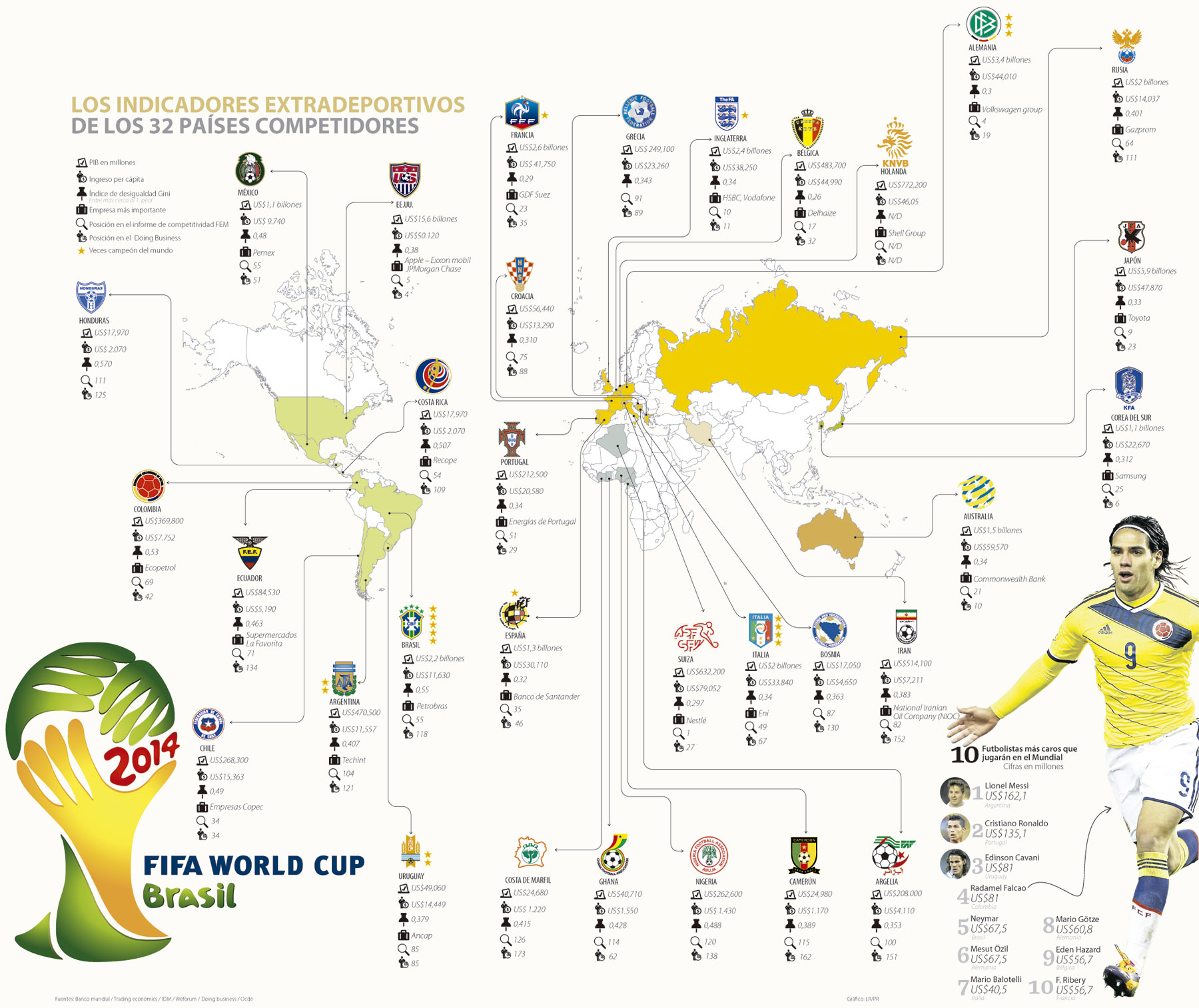 Además de los indicadores en el fondo, otros millones estarán en el terreno: los 10 futbolistas más caros que jugarán en Brasil suman más de US$808 millones. Entre ellos están Ribery, Götze, Balotelli, Hazard, Messi y alguien que hace a Colombia sentir potencia, Falcao.