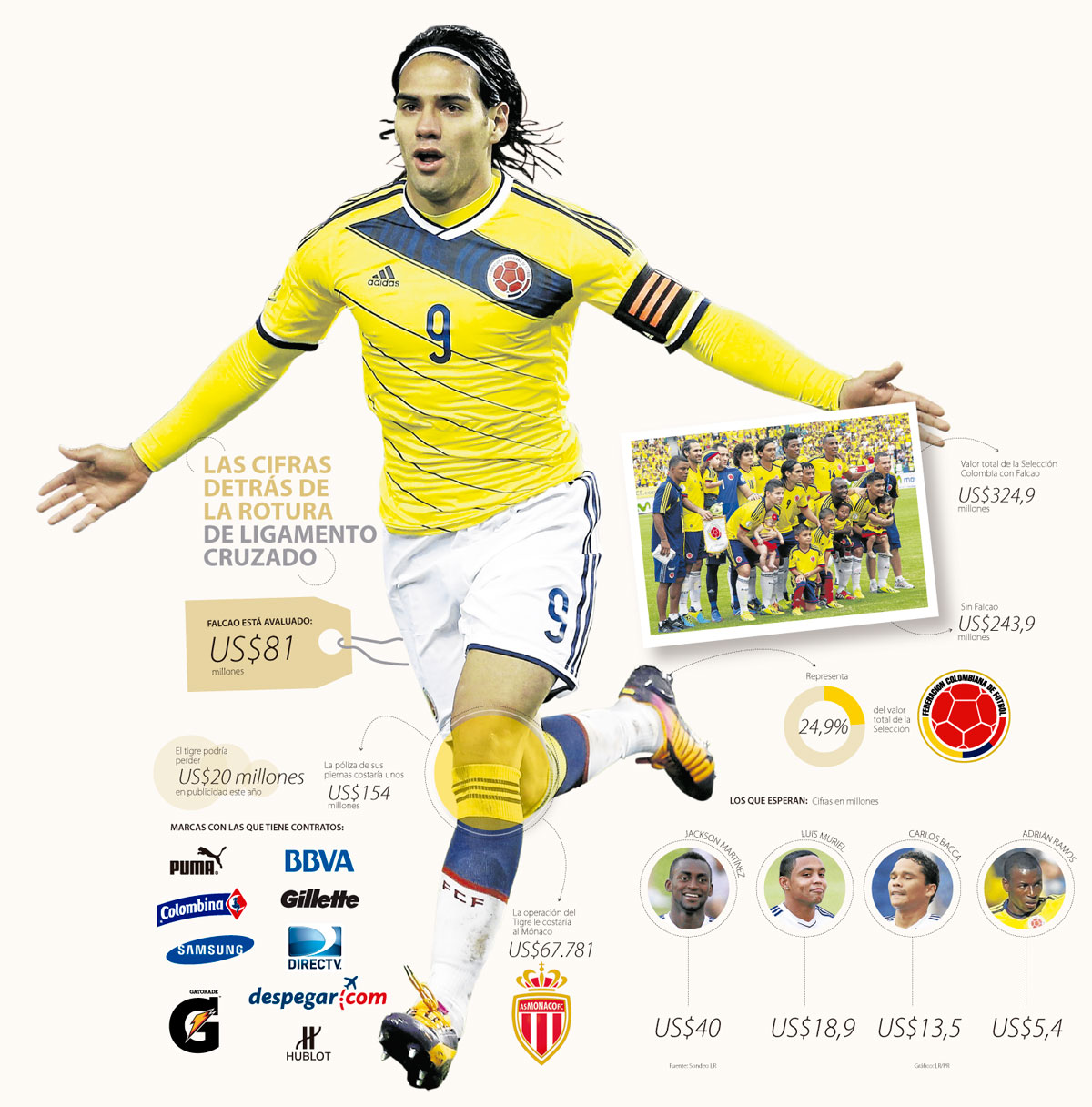 La lesión que podría dejar a Falcao García por fuera de la Copa Mundial Brasil 2014 le costaría US$154 millones solo en aseguramiento a la empresa que le estuviera custodiando las piernas, y 50% de los ingresos publicitarios del futbolista, que están alrededor de los US$40 millones al año.