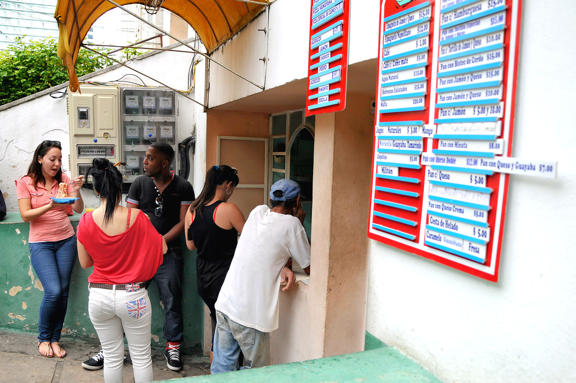 Así se les conoce a los restaurantes en Cuba, paladares, como la cafetería D’Karmita. Ya es mediodía del sábado y el sol no termina de despertar. Bajo el cielo nublado, estudiantes de una universidad cercana se agolpan a la puerta del negocio, administrado por su dueña, Carmén. Le sirve a una joven un plato de spaghetti con salsa de tomate y queso, por 12 pesos nacionales. Sus hijos amasan en el fondo. Sale una pizza especial de carne, con pedacitos desmechados y tiritas de queso, por 20 pesos nacionales. Una página blanca arrancada de un cuaderno hace las veces de servilleta.