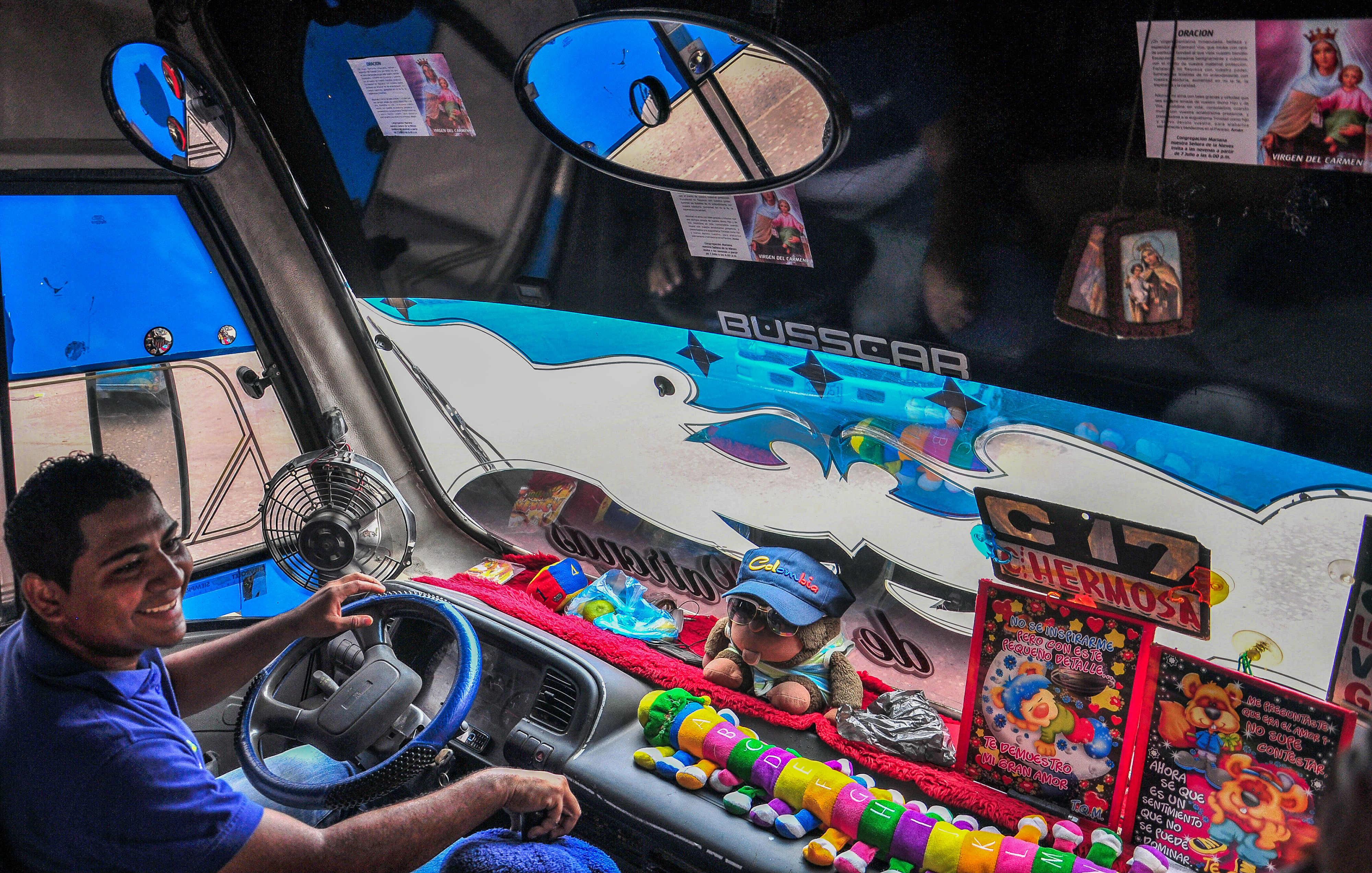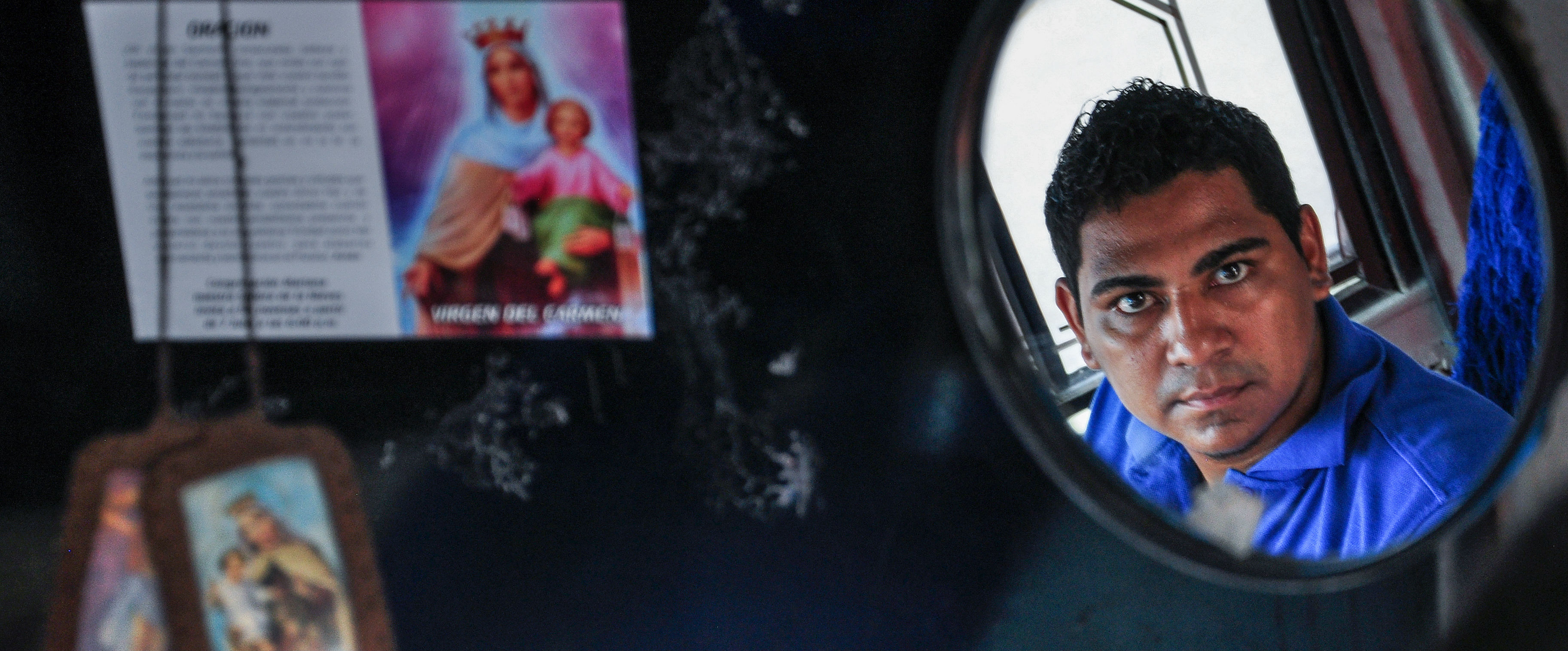 Jaider Santana empezó a conducir cuando tenía 18 años. Hoy tiene 28. Se dedicó a esto “por la costumbre… desde pelaíto iba con el viejo mío”, que era ayudante de buses. Ahora, del volante obtiene el dinero para sostener a sus 3 hijos: Jaider Jesús, el de cinco años que “ya está bien”, otro de ocho meses, y uno más que está en el vientre de su esposa, María Cantillo. Uno de sus hermanos es mecánico, el otro, conductor en la Policía. Mientras recibe monedas de pasajes en la cabina bordada con flecos azules, rodeado de calcomanías con oraciones a la Virgen, dice que le reza en cada viaje. Aunque el bus no es suyo, planea sacarlo temprano en una procesión para “bendecirlo”.