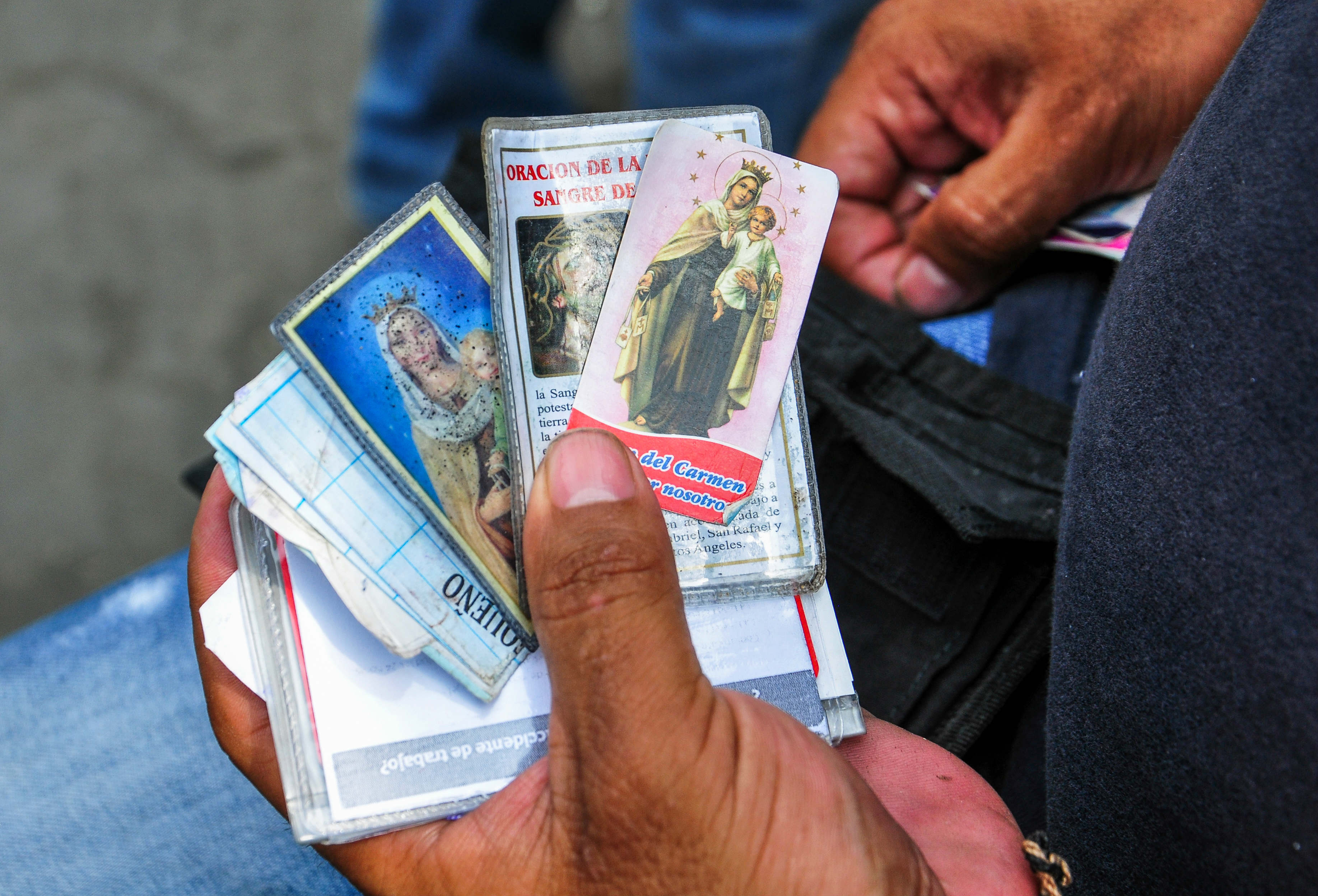 Jáider Santana mira a través del retrovisor. Al lado las imágenes de la virgen.